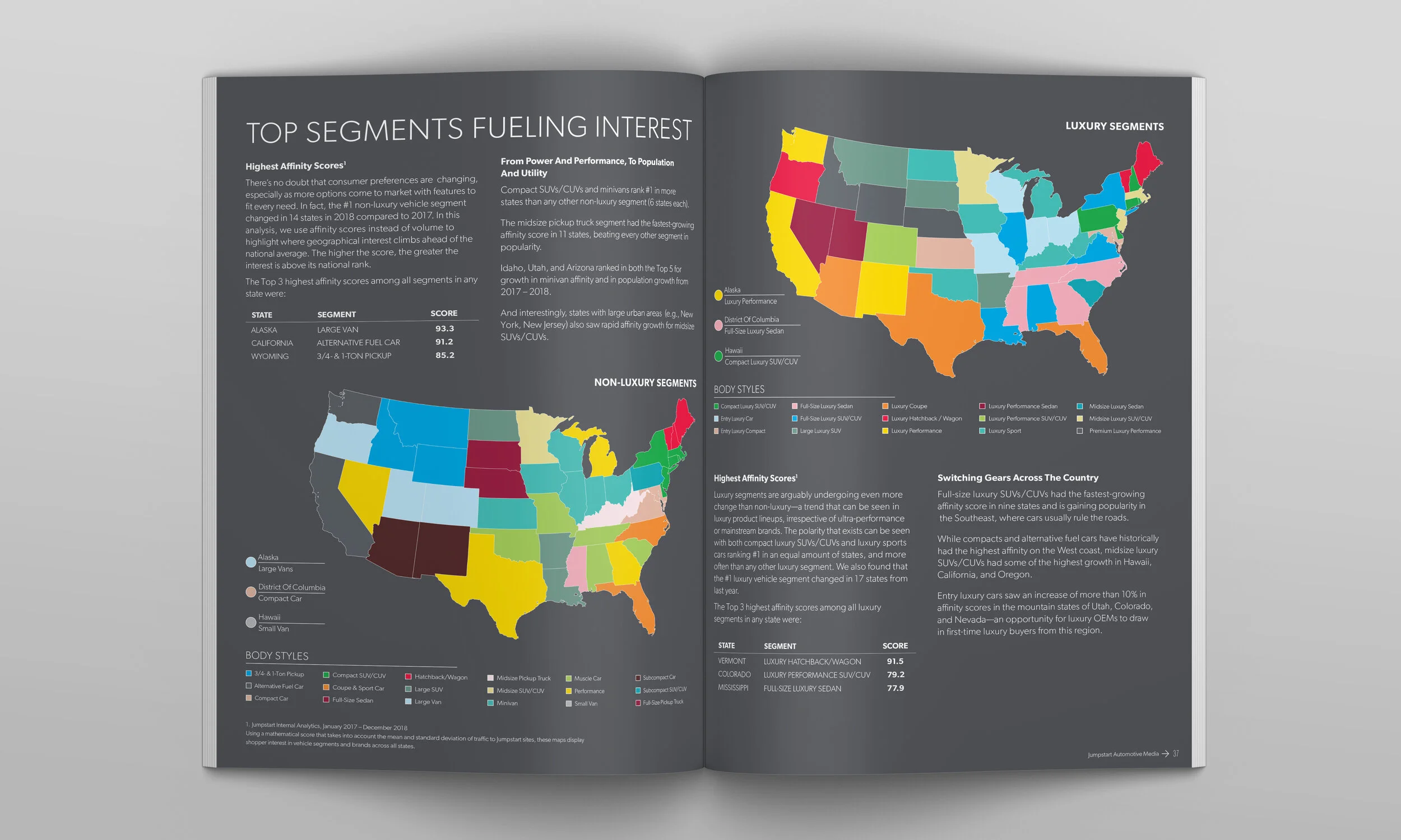 Looking Back Looking Forward is a yearly publication that helps marketers better understand the fast-moving nature of the automotive industry. As Lead Designer, I was responsible for the visual design and layout of the 2018–2019 publication. This included streamlining the process of importing data, data visualization, managing a team of freelance designers, and overseeing production.